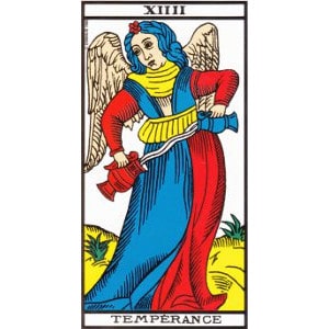 Le chiffre 14 au tarot est associé à Tempérance, cet ange qui symbolise la circulation des énergies, entre don et réception, dans nos relations sociales et amicales. Elle représente la diplomatie, la médiation, elle trouve des solutions pour chacun. Elle est bienveillante et instaure un climat agréable dans les relations, tout ce dont nous avons besoin pour nous épanouir dans nos liens amoureux, amicaux.