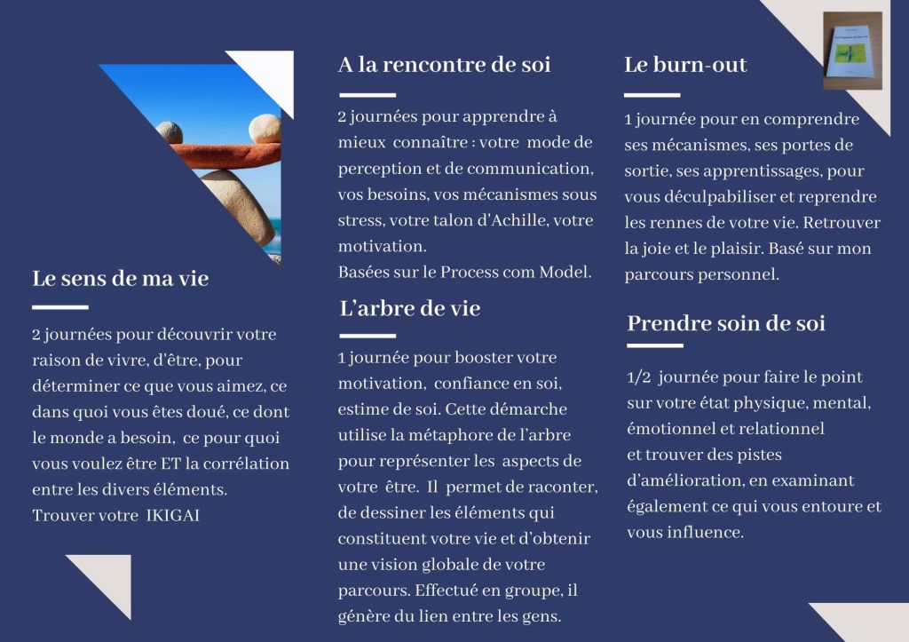 Ayant connu un burn-out, il y a une dizaine d’années, je peux vous accompagner pour prendre soin de vous de manière préventive, pour attirer votre attention sur les signes avant coureurs, pour vous aider à sortir du burn-out et éviter ses pièges de rechute possible, en plaçant les limites et balises nécessaires à votre mieux être.
